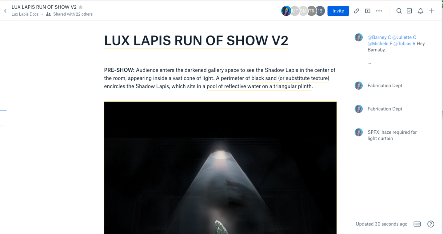 In early 2019, Karen O and Danger Mouse released the hit album Lux Prima. To accompany the record, they assembled a team of world-renowned designers, producers, and directors to create a multi-sensory art installation called “An Encounter with Lux Prima”, which was conceived and executed in Dropbox and Dropbox Paper.